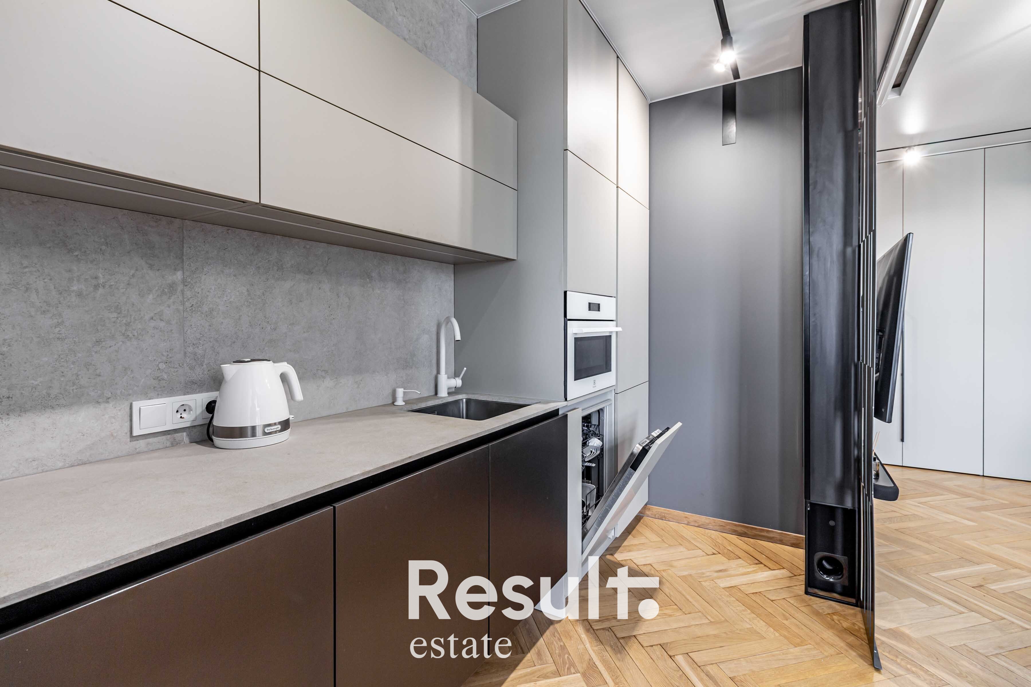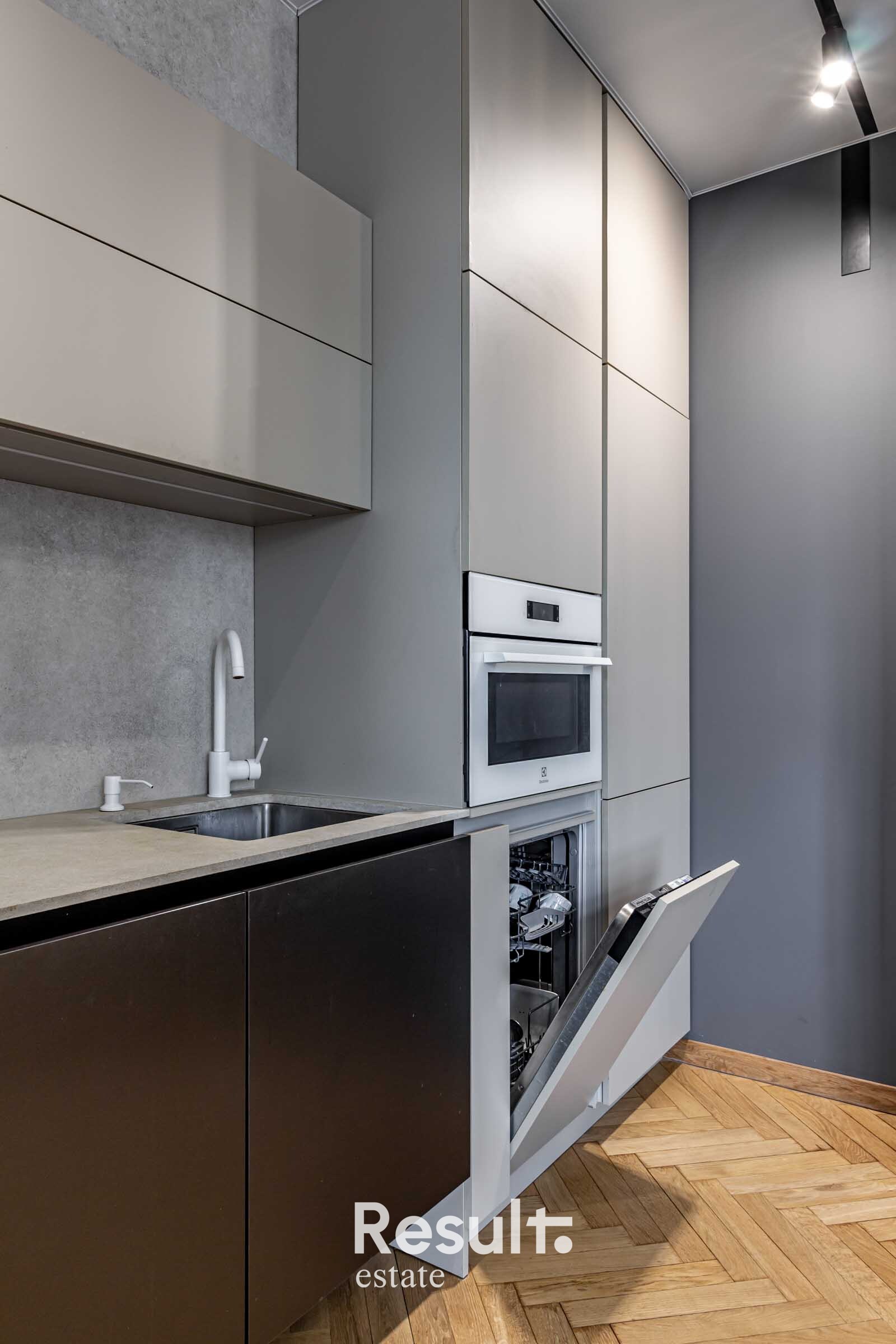 Кухня-гостиная полностью укомплектована встроенной техникой: посудомоечная машина, варочная панель, вытяжка, холодильник, духовой шкаф. Всё готово для ежедневного использования.